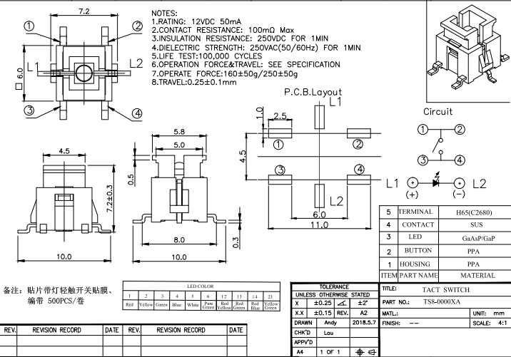 接觸電阻:50mΩ(max)絕緣電阻:100MΩ(min)